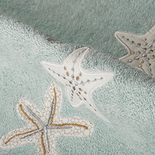- Sequin shells features embroidered starfish on off-white appliques, highlighted with metallic thread. The bath and Hand sizes are finished with a matching border