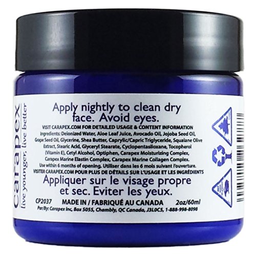 -. Binding : Misc. -. Brand : Carapex -. EAN : 0095225262777 -. Feature : A rich, yet not greasy natural cream that quenches your skin's thirst for moisture, elastin and collagen, leaving your skin supple, radiant and rejuvenated / Lessens the appearance of lines and wrinkles with our exclusive Carapex Elastin and Collagen Complex and Moisturizing Complex / Soothes and nourishes your skin with a blend of natural olive oil, jojoba oil, avocado oil, grape seed oil, shea butter and vitamin E / Penetrates deeply into your skin to moisturize and protect your skin during the night, delivering a younger, healthier look in the morning / Made in Canada with natural elements, paraben-free, harsh chemicals-free, fragrance-free, never tested on animals -. Label : Carapex -. Manufacturer : Carapex -. Model : CP2037 -. MPN : CP2037 -. PackageQuantity : 1 -. PartNumber : CP2037 -. ProductGroup : Beauty -. ProductTypeName : BEAUTY -. Publisher : Carapex -. Size : 60ml -. Studio : Carapex -. Title : Carapex Natural Anti-aging Night Cream with Elastin & Collagen, for Dry to Combination Skin, Fragrance Free, Perfect for Sensitive Skin, 2oz -. UPC : 095225262777