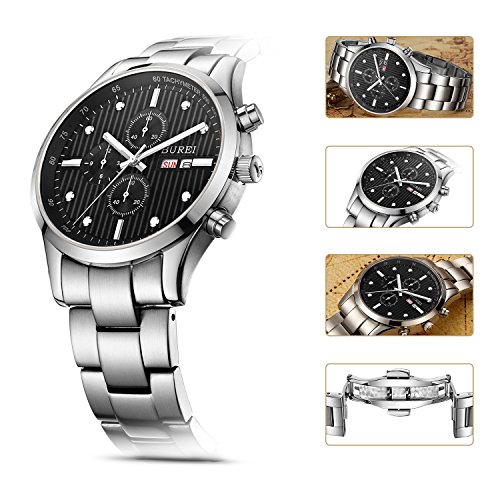 -. Feature : With ultra-precise Japanese quartz movement and sleek, dramatic style. / 316L stainless steel, sapphire crystal lens; hypoallergenic, corrosion- and scratch-resistant, water-resistant to 50m (165ft). / Day-and-date calendar windows, seconds-minutes-hours chronograph/stopwatch; simple operation with professional versatility. / 30 day money back guarantee and full manufacturer warranty for up to 2 years, ultimate customer satisfaction. / Case diameter 42mm, band length 180mm, band width 21mm; includes gift bag, watchband link remover tool; additional colors and styles available from BUREI.