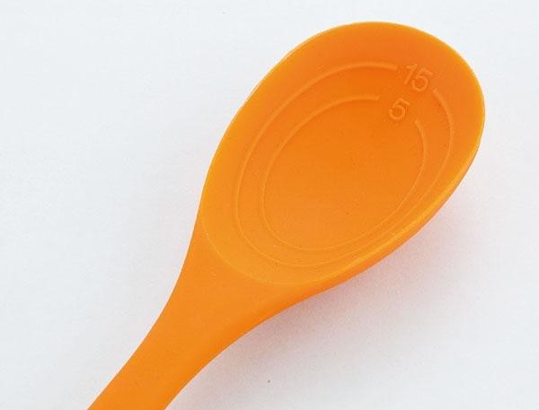 | 小さじ1と大さじ1の目盛が付いた計量スパチュラ♪液体調味料を量りながら、そのまま炒めたり、混ぜたりできます。全体がシリコーン製なので、フライパンや鍋などの金属を傷つけません。 |