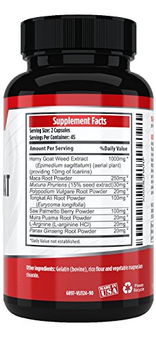- Feature : NATURAL & 100% SAFE - Our proprietary formula is crafted in the USA by our team of experts in a GMP/FDA registered facility. This specific blend of Horny Goat Weed we produce uses only the highest quality ingredients. Each bottle is carefully inspected for quality and consistency before leaving the facility. Forget trying drugs and steroids that have a list of nasty side effects. Ours is safe, natural, and most importantly effective. / INCREASE YOUR ENERGY & LIBIDO - This Horny Goat Weed is guaranteed to provide you with more energy in the bedroom. Be in the mood to last longer and be able to push yourself further! Cheaper products use inferior ingredients and are manufactured at low cost facilities that don't work. Don't trust any other brands that make false promises. Our Horny Goat Weed actually works! / FAST & EFFECTIVE - Each serving of our product contains 1000 mg of Horny Goat Weed & 250 mg of Maca Root alongside with other ingredients especially formulated to work immediately and effectively. Our special blend has been tested numerous times and provided back with positive results. / WORKS FOR BOTH MEN & WOMEN - This premium formula that will enhance sexual performance and maximize energy levels for both men and women. What does increase in performance and energy mean? More power and more confidence in the bedroom and in your personal daily life! / 60-DAYS 100% MONEY BACK RISK-FREE GUARANTEE - We're so confident about how effective our product is that we'll refund you back 100% of your money if it's not for you. No questions asked. We are taking the risk out for you. You have nothing to lose.