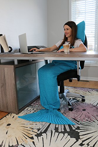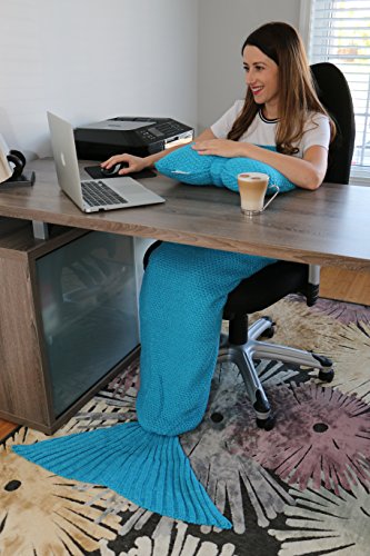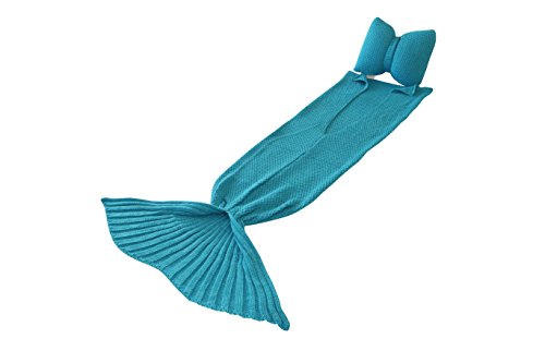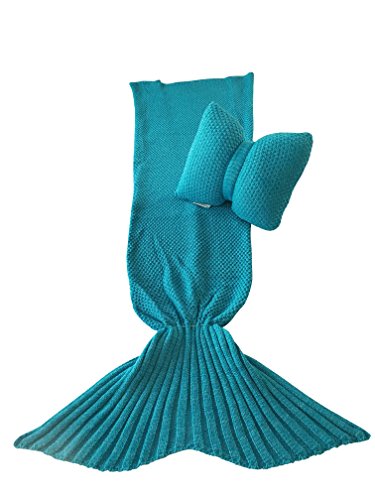 Mermaid Tail Blanket and Bowtie Pillow By Viva Blanket: Knitted Sleeping Blanket With Decorative Cushion In 4 Colors – The Best Gift For Girls, Kids & Adults (Blue)