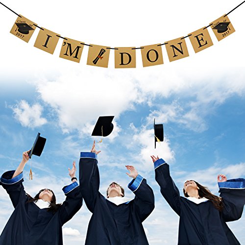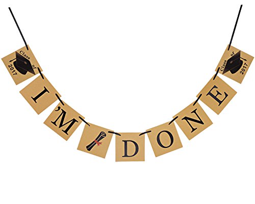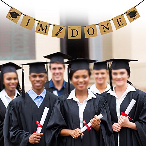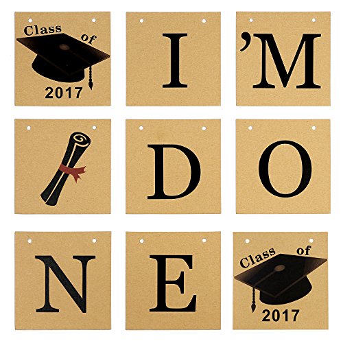 - Comes with 9 parts writing “IM DONE” words and both end with graduation cap symbol&class of 2017 letters,easy assemble needed,Black String totally length 10.5ft,each flag measures 5.1" W x 5.1" H