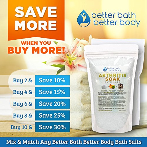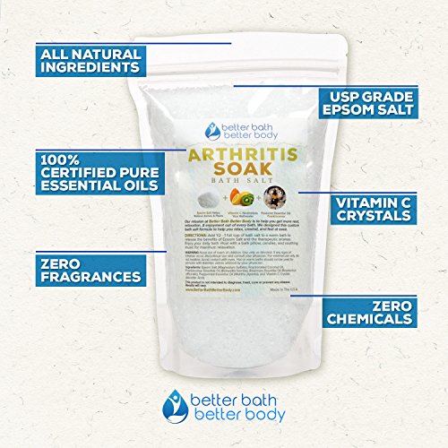 Arthritis can be a debilitating issue. With joint pain and stiffness throughout the body, fatigue, tenderness, swelling, and general weakness, it can be downright uncomfortable. Now you can get natural arthritis relief with this all natural Bath Salt Arthritis Soak designed to help reduce pain, inflammation, joint pain, and general discomfort caused by arthritis symptoms! *PURE EPSOM SALT BASE* We start with a Pure Epsom Salt Base of 100% pure Magnesium Sulfate, known to have detoxifying properties that help relieve muscle pain joint pain naturally. Epsom Salt is the primary ingredient in this "Arthritis Bath Salt" soak and makes the perfect addition to your Arthritis bath soak regimen. *PURE FRANKINCENSE ESSENTIAL OILS* Next, we add Certified Pure Frankincense Essential Oil to create an aromatherapy and all natural healing blend perfect for helping relieve Arthritis symptoms. Frankincense has been shown to help reduce prevent inflammation and joint pain, common arthritic symptoms. We also include Rosemary Peppermint Essential Oils to balance the aroma and provide supporting benefits. *NEUTRALIZING VITAMIN C* Finally, we include Vitamin C (ascorbic acid) to help neutralize that nasty Chlorine Ammonia lurking in your water. Vitamin C does this naturally effectively, "grabbing" onto chloramine molecules and neutralizing them in a natural way. *NO PERFUMES DYES* Unlike many other bath salts companies, we never include chemical additives like "Fragrance" that could prove harmful to your body and your mind. We take great pride in offering only all-natural bath salts to help you relax and solve common everyday problems like Arthritis. NOTE: Seek the advise of your doctor before starting bath regimen, especially if you're using medication or have diabetes. This product is not intended to cure, prevent, or treat disease. 0 |