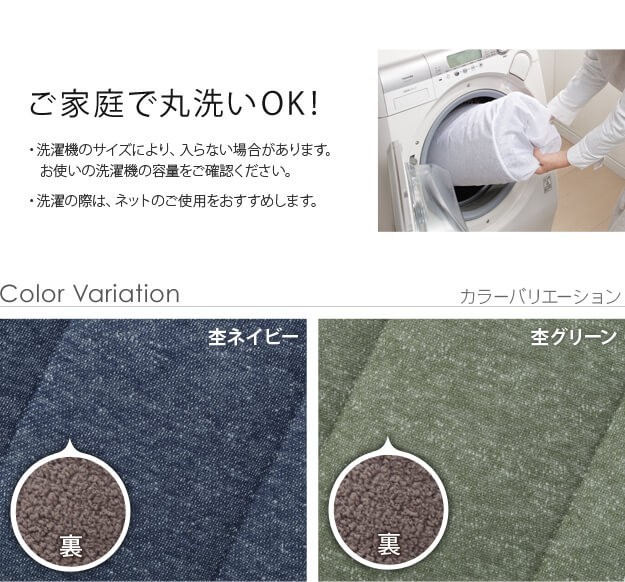 ※メーカー直送のため代金引換はお受けできません。※沖縄・一部離島は別途送料がかかります。お見積もりいたしますのでお問い合わせ下さい。【カラーバリエーション】杢グリーン・杢ネイビー【仕様】表地:ポリエステル65%・綿35%裏地:ポリエステル100%(シープボア)中綿:ポリエステル100%【サイズ】幅230x奥行190cm重量:約3kg中綿:約740g株式会社ナカムラ(21101874)