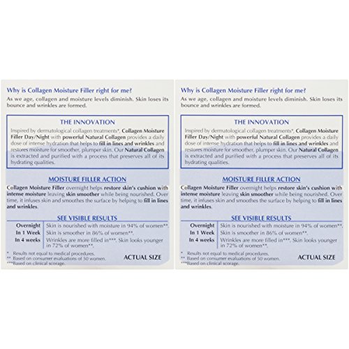 A dose of intense hydration and natural Collagen in Collagen Filler Moisture Day Lotion and Day/Night Cream is essential for younger-looking skin. Rich moisture instantly restores skin's cushion and bounce. Over time, the powerful natural Collagen helps fill in lines and wrinkles, leaving your skin smooth and plump. Use it for a complete collagen-infused skincare regimen. In just 4 weeks 78% of women saw filled in wrinkles. Based on a consumer evaluation of 50 women.Feature