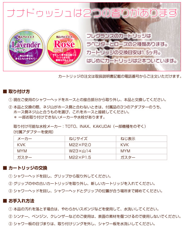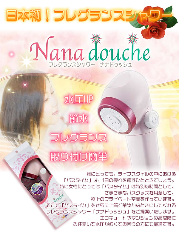 「バスタイム」をさらに上質で華やかなときにしてくれるフレグランスシャワー「ナナドゥッシュ」をご提案。香りとともに、シャワーが断続的に出ることによるマッサージ効果が期待できます。