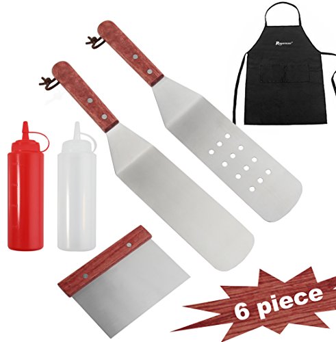 ROMANTICIST 6Pcs Professional Grade Grill Griddle Accessories BBQ Tool Kit - 2 Griddle Spatulas, 1 Scraper Cleaner, 1 Water Proof Apron, 2 Bottles - Great for Flat Top Cooking, Camping and Tailgating