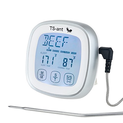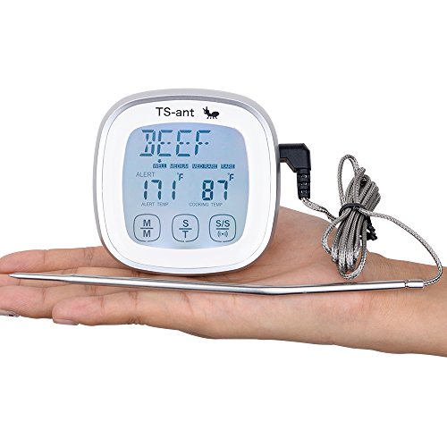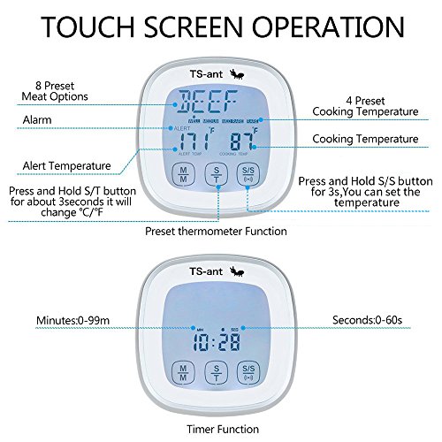 - 【TS-ant Touch Screen Design】-Large screen display that makes reading clear. BACKLIT LCD Display:TS-ant BBQ thermometer shows the temperature clearly in the evening. Press the button,the screen will light for 10 seconds. It makes barbecue and picnic easier and more convenient at night.