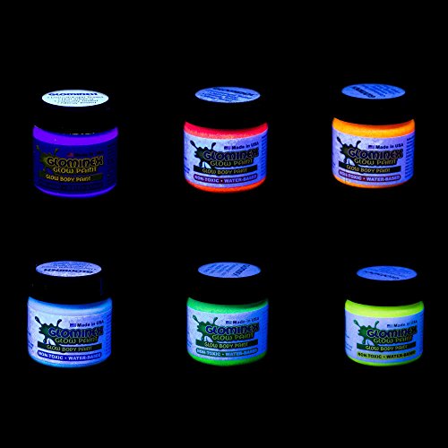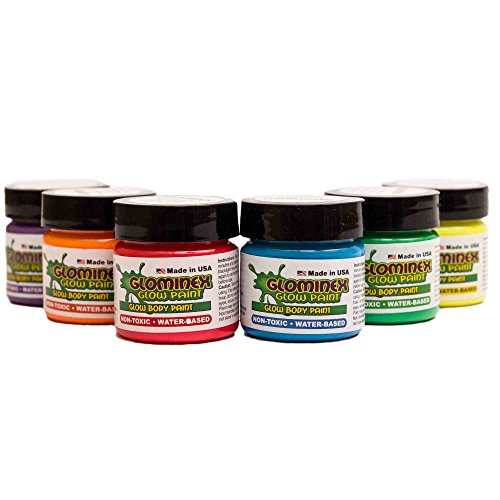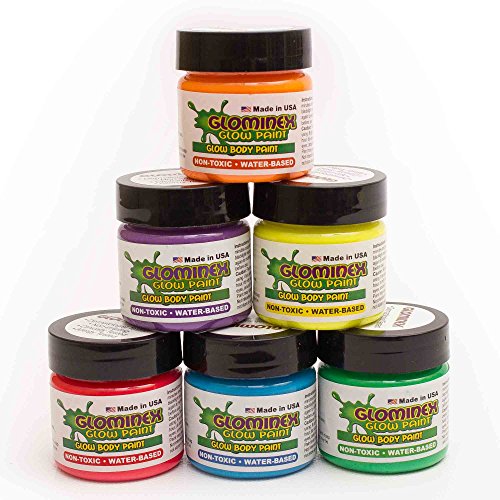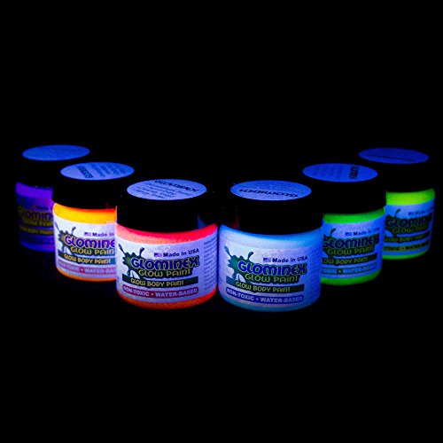 Glowminex glow body paint is fun for everyone This paint glows in the dark and looks like regular paint in daylight Each jar holds 1 ounce of non-flammable acid-free lotion based body paint Perfect for Halloween costumes or glow parties Sold an assortment of 6 jars Each jar contains 1 ounce 30 mL of paint Caution This product is not recommended for children under 3 years of age