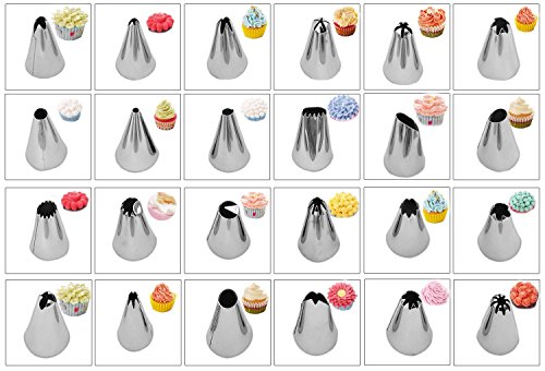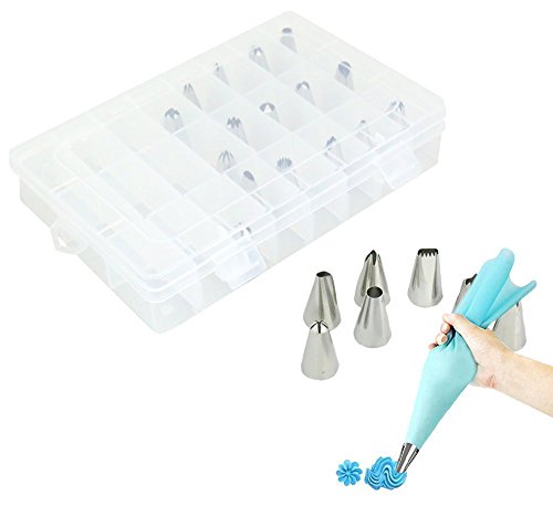 - ★The cake piping nozzles kit is stored in a handy clear compartmentalized storage box, includes 24 piece icing tips, 1 plastic coupler, 12 silicone baking muffin cups, 2 pastry bags, 1 flower nail & 1 flower lifter with cleaning brush, the entire kit is nice and compact, you can still easily find the tip you want in its' own little compartment.