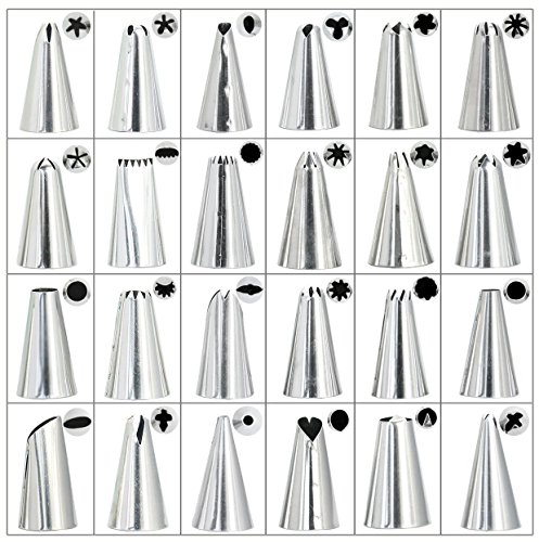 Joyoldelf Cake Piping Nozzles Kit - 24 Icing Tips with Plastic Coupler & 2 Reusable Silicone Pastry Bags, Decoration for Cakes Baking Cookies Pastry Cupcakes, Food Grade 430 Stainless Steel