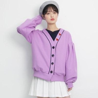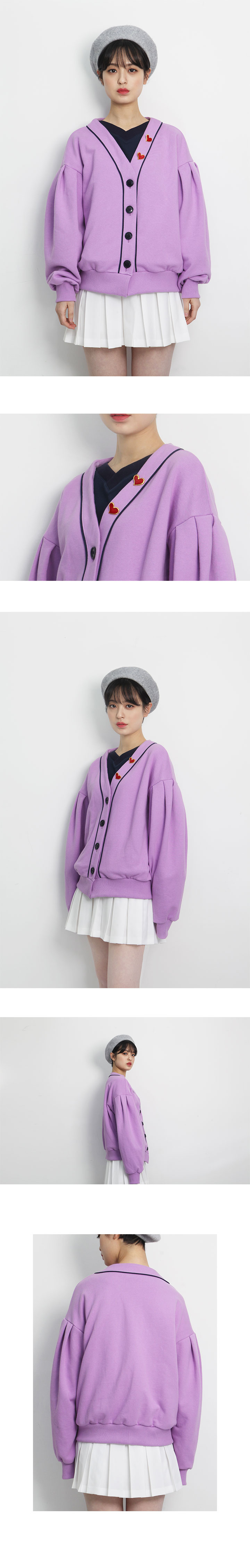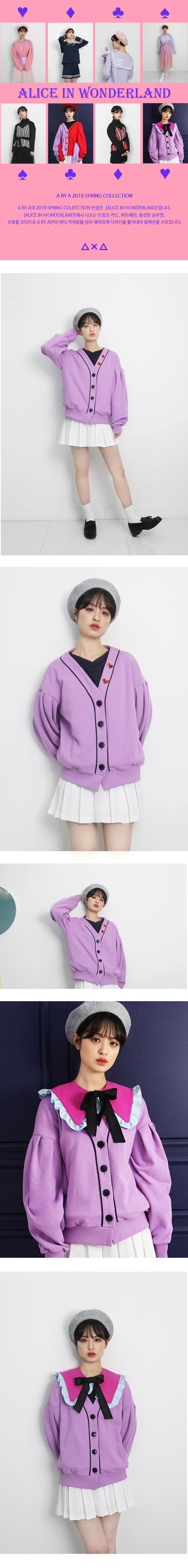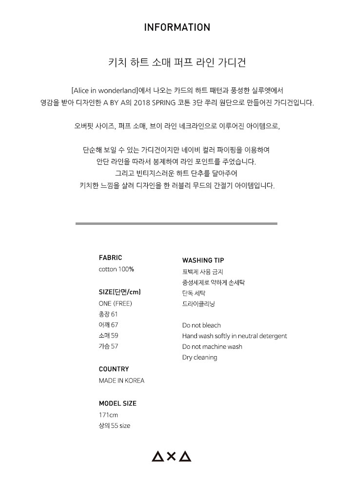 | 키치 하트 소매 퍼프 라인 가디건 [Alice in wonderland]에서 나오는 카드의 하트 패턴과 풍성한 실루엣에서 영감을 받아 디자인한 A BY A의 2018 SP.R.ING 코튼 3단 쭈리 원단으로 만들어진 가디건입니다. 오버핏 사이즈, 퍼프 소매, 브이 라인 네크라인으로 이루어진 아이템으로, 단순해 보일 수 있는 가디건이지만 네이비 컬러 파이핑을 이용하여 안단 라인을 따라서 봉제하여 라인 포인트를 주었습니다. 그리고 빈티지스러운 하트 단추를 달아주어 키치한 느낌을 살려 디자인을 한 러블리 무드의 간절기 아이템입니다. |