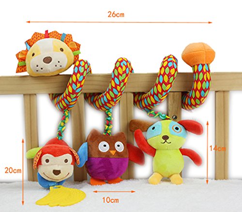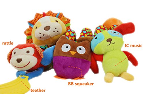 -. Feature : Attaches easily to most crib,carriers, strollers or play gyms / With hanging plush toys featuring a squeaker, rattle and crinkle. / Deluxe plush fabrics / Ability Training: Emotional, visual, intellectual development, grasping, sensual, hand-eye coordination, interactive toys, hearing, parent-child communication / BPA free, great gift for infant toddler boys and girls.