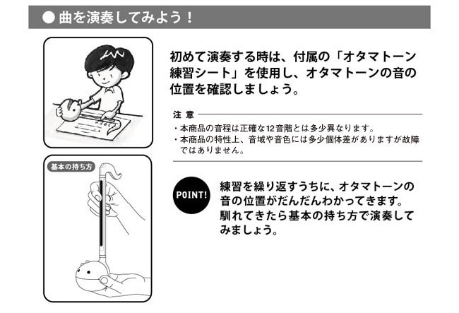 音符の形をした「オタマトーン」はカンタンな電子楽器です。トイのような見た目と弾き方ですが、少し練習すればちゃんと曲を弾く事が可能です。 使い込むほどに自分のオタマトーンの音の位置がわかってくるので、楽譜が無くても メロディーを思い浮かべて曲を弾く事ができるかも!? 単純に音を楽しむ事ができる楽器です。 |