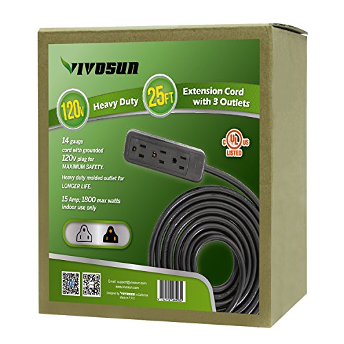VIVOSUN 25FT 3-Outlet 14 Gauge 120V Heavy Duty Power Strip Extension Cord UL Listed Black
