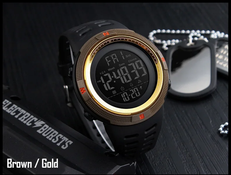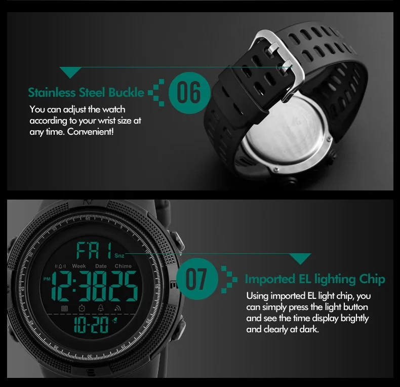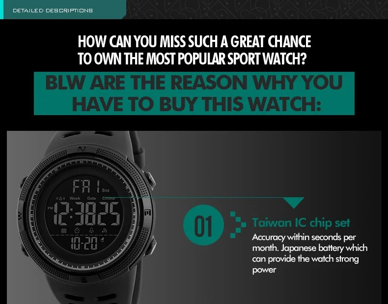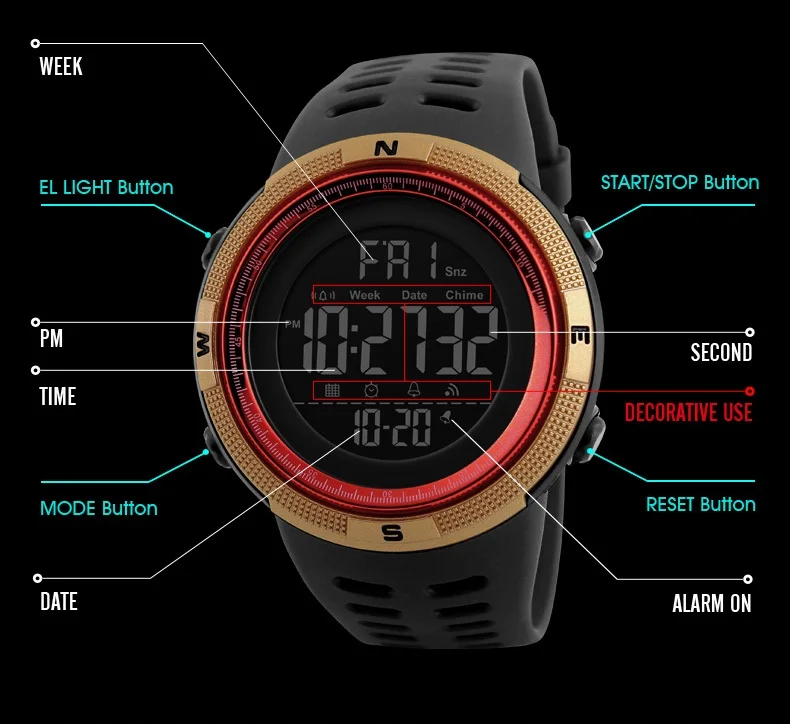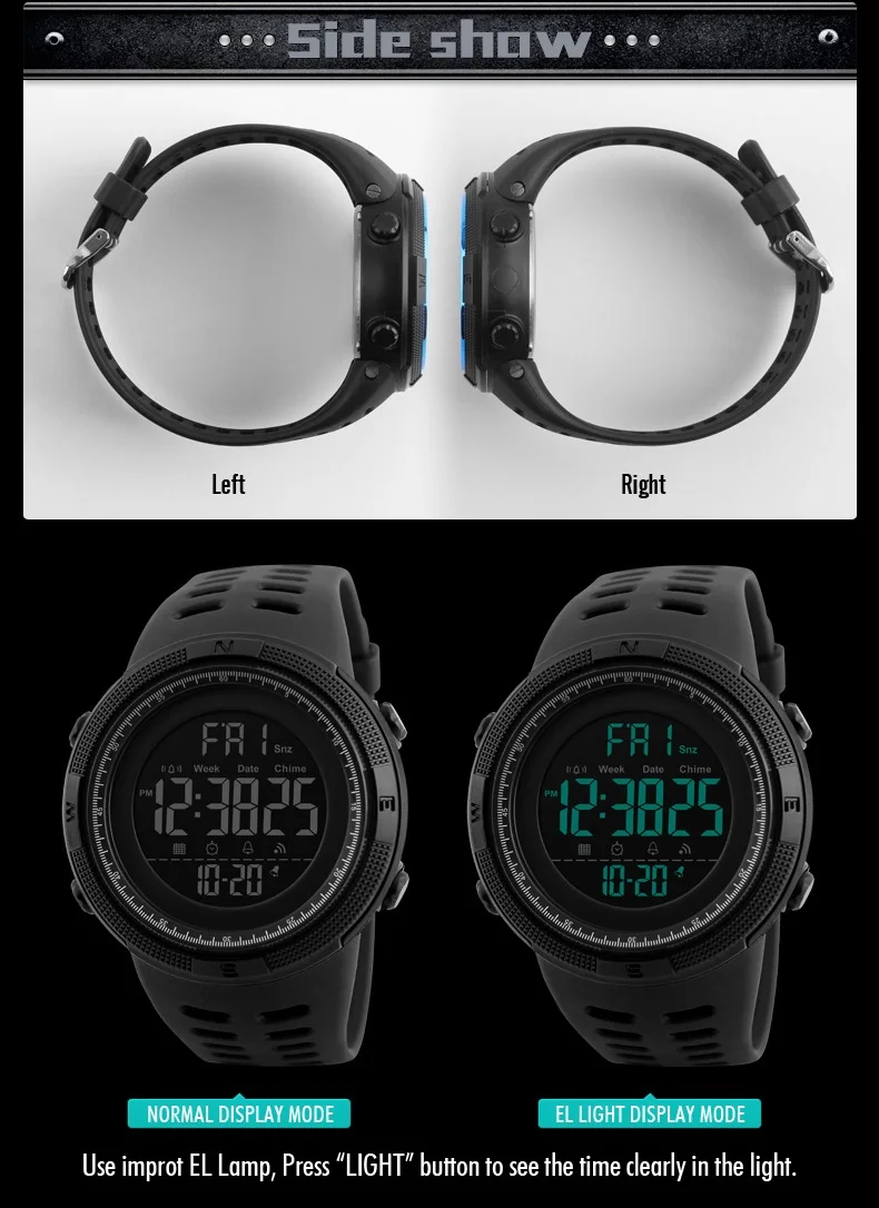 Feature:Alarm,Back Light,Water Resistant,Multiple Time Zone,Chronograph,Shock Resistant,Stop Watch,Complete Calendar,Auto Date,LED display