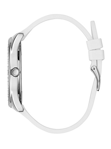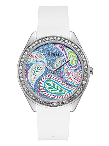 This analog timepiece is designed with a luxe silver-tone and glitter dial with a colorful paisley design. Features a crystal bezel and white silicone strap for fashion and functionality alike.Feature