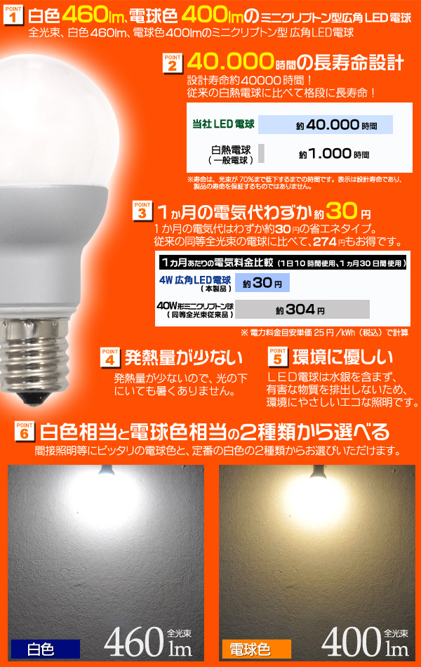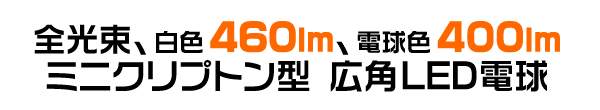 全光束、白色460lm、電球色400lm! ミニクリプトン型広角LED電球!