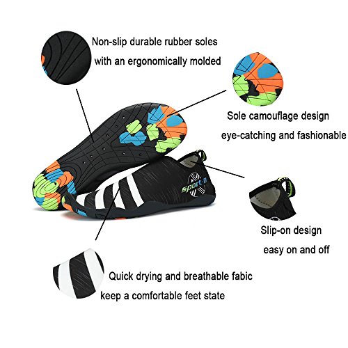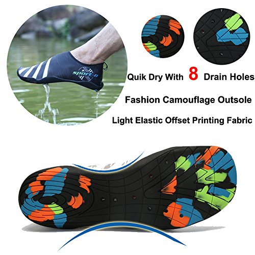 -. Feature : FLEXIBLE & LIGHTWEIGHT: The lightweight barefoot shoes like aqua socks, with breathable and stretched fabrics on the upper, which can be used as indoor slippers, flexible and comfy / WATER SHOES UNIQUE DESIGN: The water shoes have stylish camouflage rubber outsole with 8 drain holes, make sure water drain out in short time / FOOT SAFETY: Durable rubber outsole and soft thickening insole can protect your feet from getting hurt by rock, hot sand and sharp objects / IDEAL APPLICATIONS: The water shoes are perfect for women, men and kids do any aquatic aerobics activity such as Beach, cruise, yoga, beach volleyball, kayaking etc. You can also wear these comfy aqua socks like house slippers, do housework, walk the dog, visit the garden and driving etc / AVAILABLE VARIOUS SIZE SERIES: Kids, men and women size are available. Please measure your feet and choose the approP.R.Iate size according to the size table
