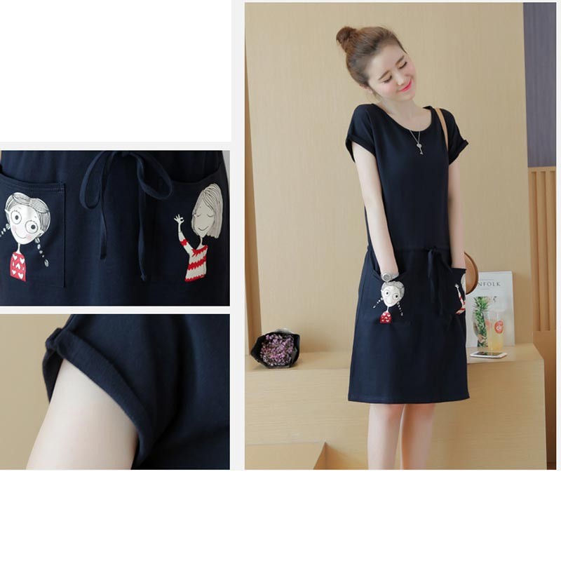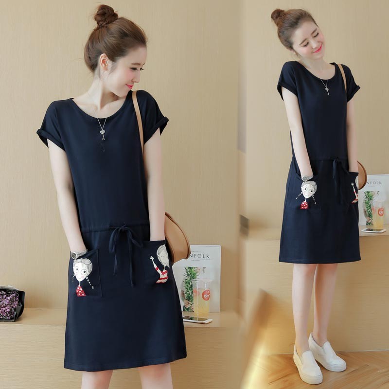 夏にぴったりのネイビーコットン半袖のひざ丈ワンピース♪