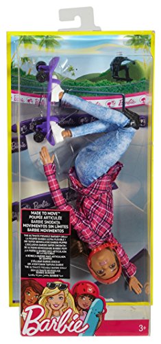 Barbie active sports dolls are ready to compete! Each Barbie Made to Move doll has 22 “joints” -- in the neck, upper arms, elbows, wrists, torso, hips, upper legs, knees AND ankles -- for flexibility and an incredible range of motion! Young athletes will love exploring the world of skateboarding with this Barbie doll. She’s dressed in a career-themed outfit and comes with accessories that add to the storytelling -- and posing -- fun! Barbie skateboarder doll looks casually cool wearing light blue leggings, a graphic print tee, plaid shirt and white sneakers. A purple skateboard and red helmet will help her land new tricks. Play out all kinds of stories and show off your moves with Barbie Made to Move sport dolls. Explore all of the Barbie career dolls because with Barbie, you can be anything (each sold separately, subject to availability). Includes Barbie Made to Move skateboarder doll wearing fashions and accessories, plus skateboard and helmet. Doll cannot stand alone. Colors and decorations may vary.Feature