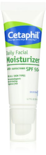 Cetaphil UVA/UVB defense Spf 50 facial moisturizer specifically formulated as a facial moisturizer provides broad spectrum UV protection with an optimum blend of five filters. The moisturizing formula hydrates the skin for 8 hours and absorbs quickly. Micronized titanium dioxide leaves no filmy white residue. Non-Greasy, lightweight, fragrance-free, non-irritating, and non-comedogenic, this moisturizing product is ideal for daily facial use.