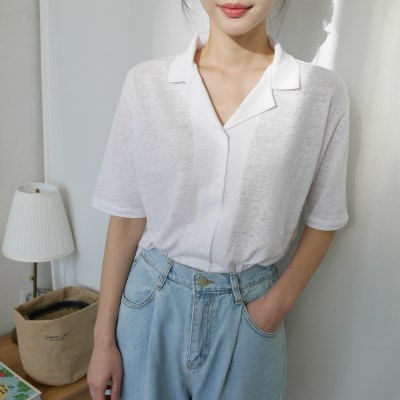 린넨 혼방 소재의 브이넥 카라 티셔츠 소개해드려요. 기본으로 착용하기 좋은 카라 티셔츠로 약간 루즈한 핏이기 때문에 캐주얼하면서 편하게 연출되어요. 목선까지 올라오는 카라티셔츠가 아닌 브이넥 라인에 카라가 달린 디자인으로 단정하면서 여성스러운 느낌도 있는 아이템입니다. 화이트 컬러의 경우 약간의 비침이 있기 때문에 이너를 좀 더 신경써서 착용해주세요. 깔끔하고 단정한 디자인으로 슬랙스, 스커트와 함께 여름철 오피스룩으로도 추천드립니다. 모델은 화이트 착용하였습니다. MODEL / 166cm , 55size , S or 26 , SHOES_240 아이보리,화이트 컬러는 교환, 환불 불가하오니 신중한 구매 부탁드려요.