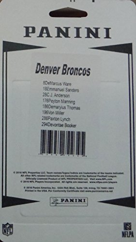 Denver Broncos 2016 Panini factory sealed 8 card team set including Peyton Manning, DeMarcus Ware, Emmanuel Sanders, C.J. Anderson, Demaryius Thomas and Von Miller plus Rookie cards of Paxton Lynch and Devontae Booker.