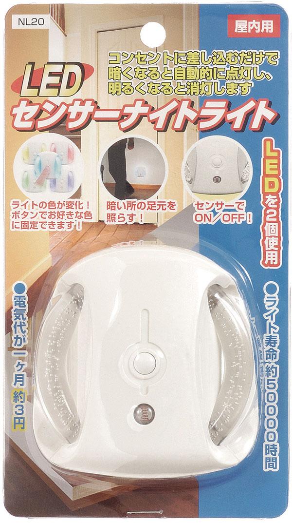 コンセントに差し込むだけで暗くなると自動的に点灯し、明るくなると消灯します。ライトの色が変化し、好きな色に固定できます。 ※サプライヤー直送品 ご注文後3~4営業日後の出荷となります【商品名】NL20 LEDセンサーナイトライト