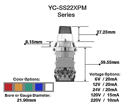 Product DescriptionYc-ss22xpma-i2g-2 YuCo 22mm 2 position maintained green illuminated selector switch 120v AC/DC. Included 1NO/NC contact block. Iec 947 certificated 250V maximum, contact 10AMP.0