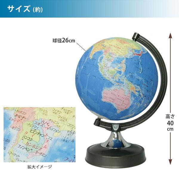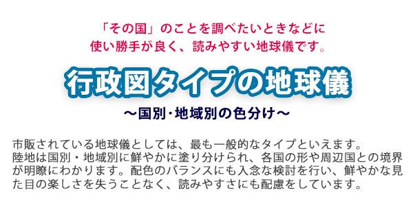 | 国別・地域別に色分けされた行政図タイプの地球儀です。5000万分の1という区切りのよい縮尺の、学習用に最適なモデルです。デザインにもこだわっているので、インテリアにもお薦めです。 |