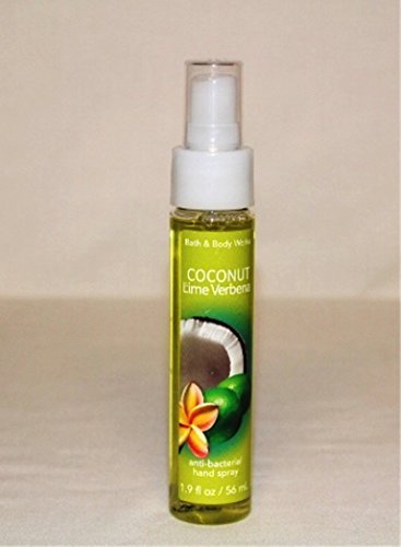 -. Binding : Misc. -. Brand : Bath & Body Works -. EAN : 0667540137193 -. Feature : A powerful germ-killing formula enriched with nourishing Aloe and Vitamin E. Leaves hands feeling clean and virtually germ-free. / An island blend of zesty lime, lemon verbena & coconut water -. IsAdultProduct : 0 -. Label : Bath & Body Works -. Manufacturer : Bath & Body Works -. MPN : AB-103398 -. PackageQuantity : 1 -. PartNumber : AB-103398 -. ProductGroup : Beauty -. ProductTypeName : BEAUTY -. Publisher : Bath & Body Works -. Studio : Bath & Body Works -. Title : Bath & Body Works ~ Signature Collection ~ Anti-bacterial Hand Spray ~ Coconut Lime Verbena~ 1.9 Fl Oz -. UPC : 667540137193