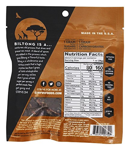 -. Feature : ADDICTINGLY FLAVORFUL: Stryve Biltong is dry rubbed with simple ingredients and cured for 21 days allowing each batch to be consistently tender. / 16 GRAMS OF PROTEIN PER SERVING: Whether you're looking to reduce hunger, gain muscle mass, or boost your metabolism, a high protein diet will help you reach your goals! / THE HEALTHIEST SNACK ON EARTH: This wholesome and nutritious snack is high in protein with only one gram of carbs, less than one gram of sugar and zero grams of fat! / CONTROL YOUR CRAVINGS: Curb those hunger pangs with a protein-packed snack and feel confident with every delectable bite. / THE PERFECT GRAB 'N GO SNACK: Our conveniently packaged biltong is perfect for the whole family. Simply toss a bag in your lunch box, briefcase, or purse and Stryve on with your day.