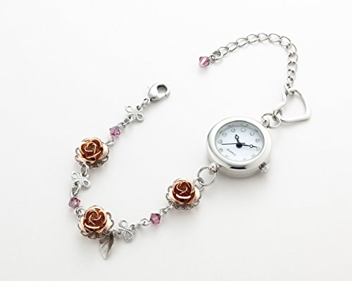 -. Feature : 手作りブレスウォッチ。 / kisaragiオリジナルデザイン。日本製。 / 全長:約18~23cm(簡単に長さを調整できます)、幅:約2.4cm、重さ:約17グラム。 / 電池入り、電池交換可能です。時計店などで電池交換できます。 / 薔薇は金属で本物のピンクゴールド仕上げがしてあります。金属:真鍮、その他。
