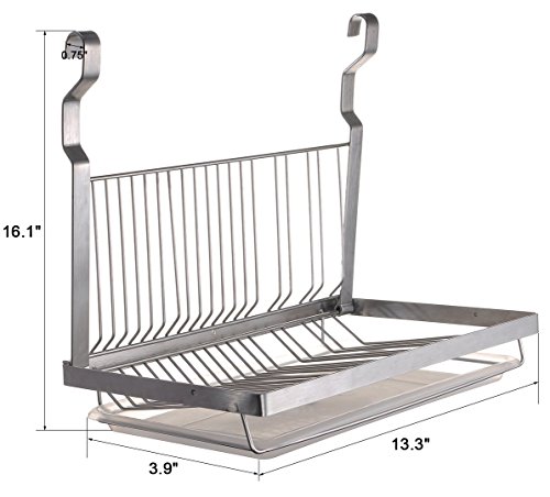 Material: 304 Stainless Steel Color:Silver Product Dimensions(L x W x H): 13.3 x 3.9 x 16.1 inches Package: 1 X 304 Stainless Steel Dish Drying Rack; 1 X Quality Plastic Dish Drain Board