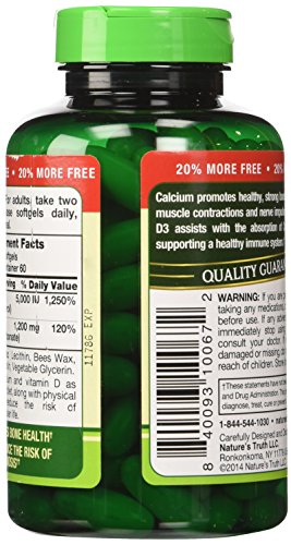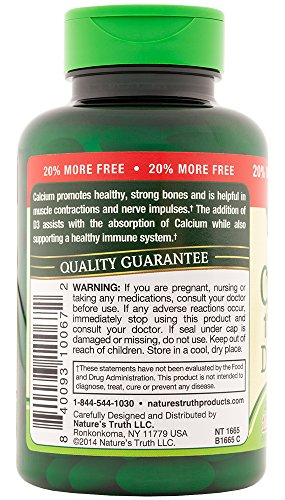 -. Binding : Health and Beauty -. Brand : Nature's Truth -. EAN : 0840093100672 -. Feature : Promotes Bone Health / Supports Immune System Health / May Reduce the Risk of Osteoporosis -. IsAdultProduct : 0 -. Label : Piping Rock Health Products -. Manufacturer : Piping Rock Health Products -. MPN : 445568 -. NumberOfItems : 3 -. PackageQuantity : 3 -. PartNumber : 445568 -. ProductGroup : Health and Beauty -. ProductTypeName : HEALTH_PERSONAL_CARE -. PublicationDate : 2015-05-19 -. Publisher : Piping Rock Health Products -. ReleaseDate : 2015-06-12 -. Studio : Piping Rock Health Products -. Title : Nature's Truth Calcium 1200 mg Plus Vitamin D3 5000 IU Supplements, 120 Count (Pack of 3) -. UPC : 840093100672