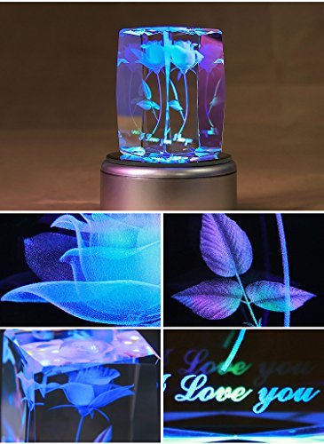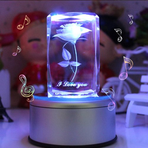 Feature : MP3 music base: With a 2G memory card MP3 Music Base allows you to download any music by yourself. Built-in lithium battery, can be recharged using / A never fade 3D rose engraved, Under the rose, it sculptures "I Love you",forever love. / K9 Crystal: Pure and luxury. Advanced laser inside carving tech insures the amazing 3D effects / Automatically rotating music box base with LED colorful lights: Gradient red, yellow, blue and green lights shine in the precious crystal rose when the music is flowing in the air. / Perfect romantic gift: For Wedding Anniversary, Valentine's Day, Christmas, and Birthday. Let Crystal Rose witness your true love.