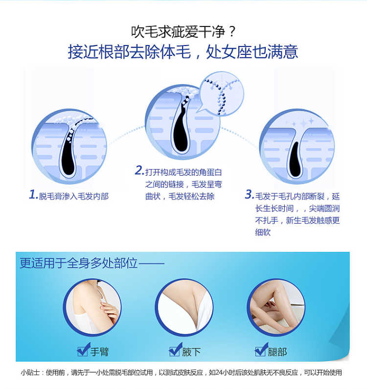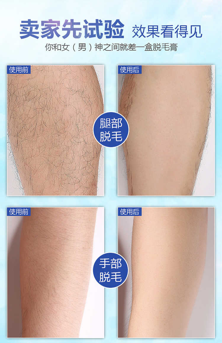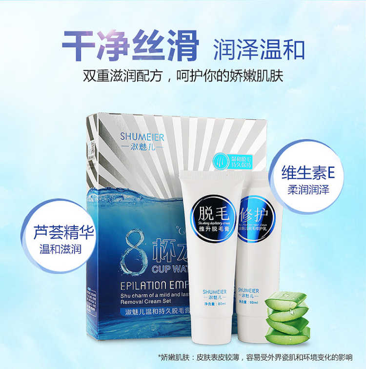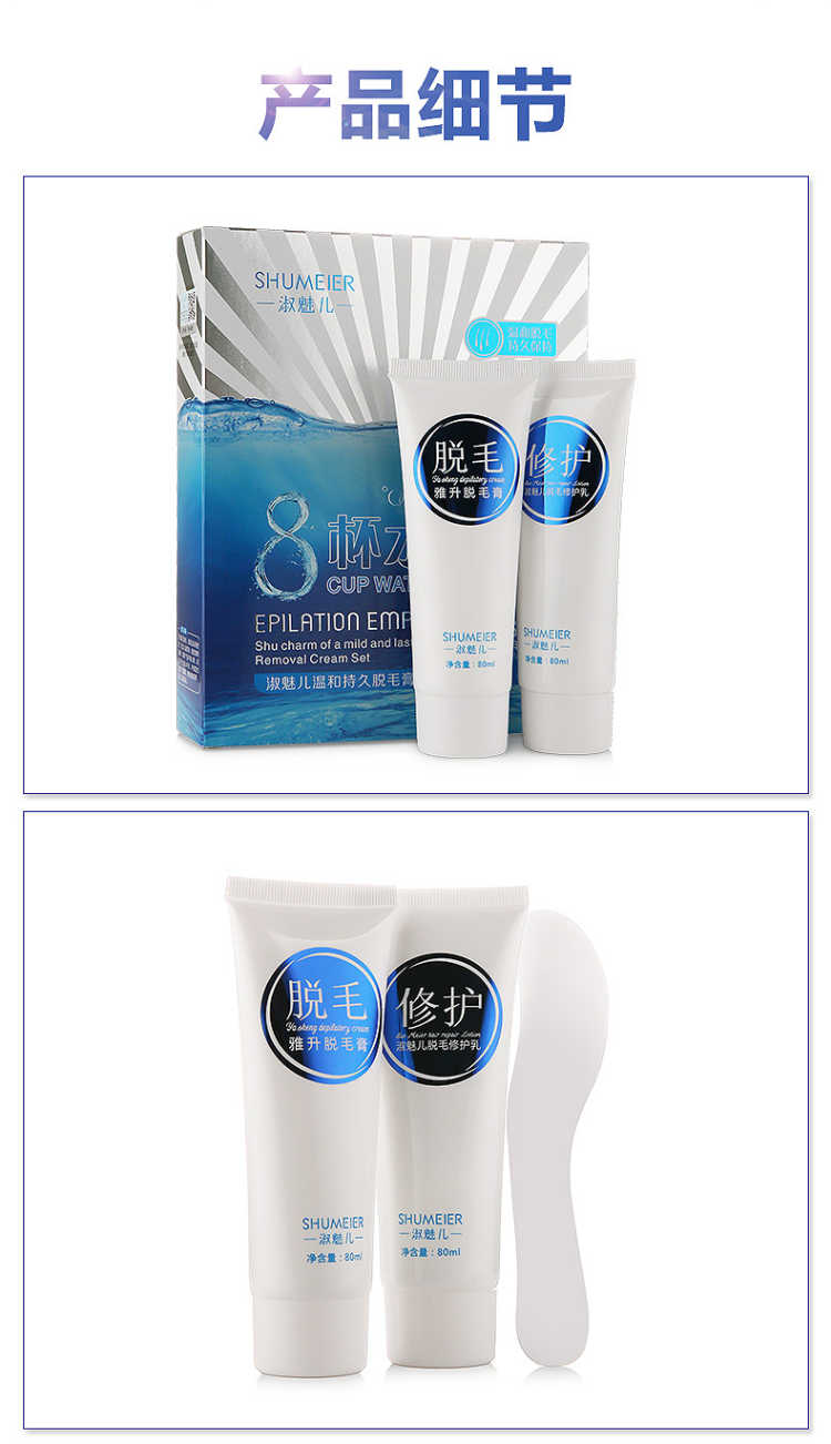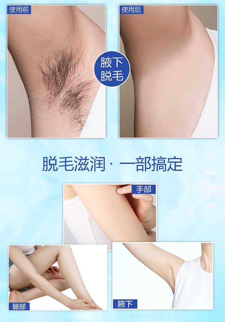 套装包含:脱毛膏80ML+绝毛液100ML+刮板,三套一疗程!和毛毛说拜拜!一次10分钟就可以脱得很干净,脱毛后涂抹附带的绝毛液,主要抑制毛囊生长,间接性的消除毛囊素的形成,从而达到永久脱毛的效果,效力强劲,能在短时间内渗透毛囊内部,在数分钟内除去男女四肢、腋下及全身多余粗硬的体毛,使皮肤恢复光滑,内涵芦荟原液,温和无痛不刺激,对皮肤无任何损伤。
