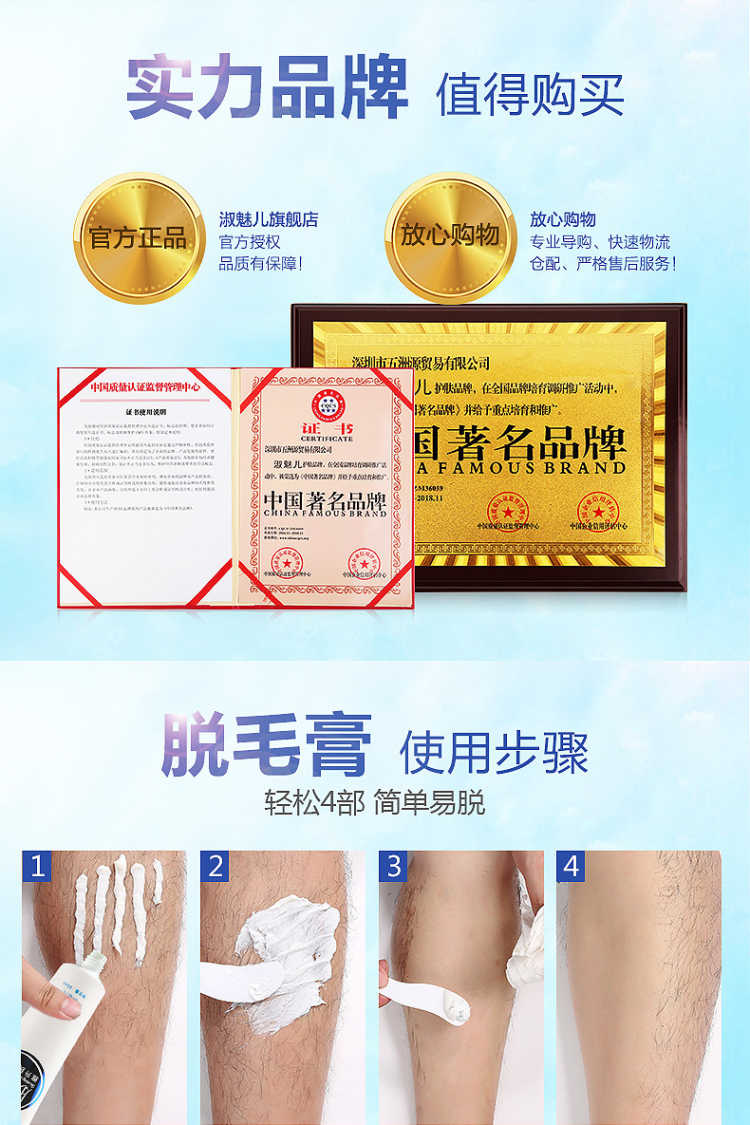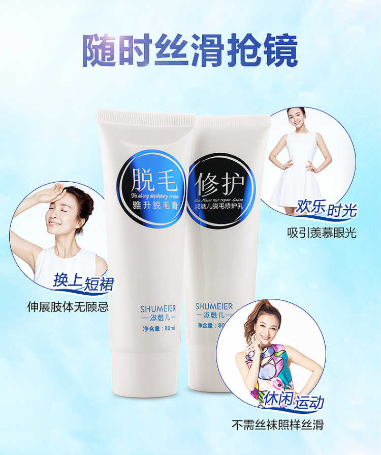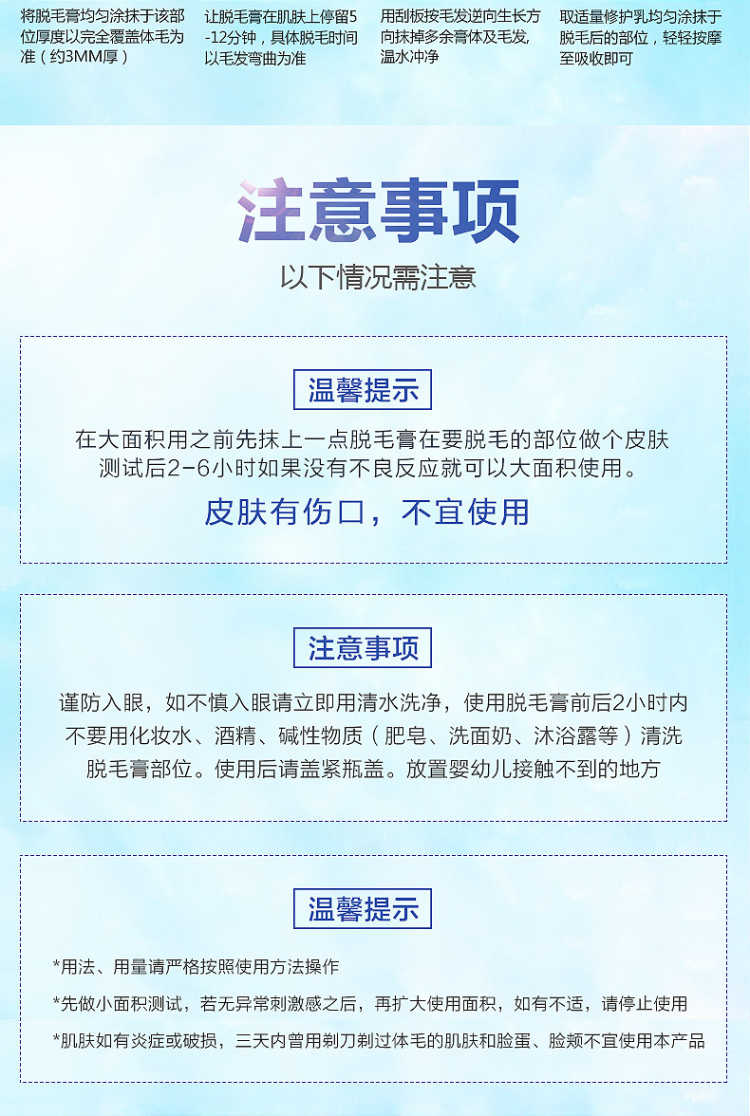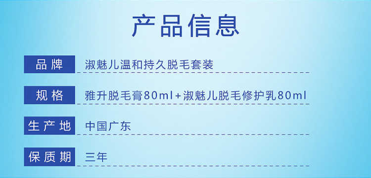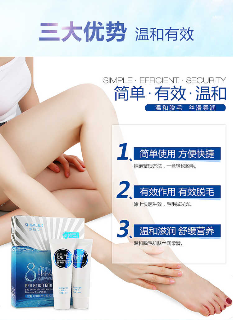 套装包含:脱毛膏80ML+绝毛液100ML+刮板,三套一疗程!和毛毛说拜拜!一次10分钟就可以脱得很干净,脱毛后涂抹附带的绝毛液,主要抑制毛囊生长,间接性的消除毛囊素的形成,从而达到永久脱毛的效果,效力强劲,能在短时间内渗透毛囊内部,在数分钟内除去男女四肢、腋下及全身多余粗硬的体毛,使皮肤恢复光滑,内涵芦荟原液,温和无痛不刺激,对皮肤无任何损伤。