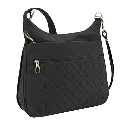 The signature quilted crossbody bag is an ideal bag whether you're off to work or a day of running errands. It's locking zippered roomy main compartment allows you to take more than just the basics with you. It features 5 RFID blocking card slots, a RFID passport pocket, a large zippered wall pocket plus a slash pocket that is ideal for glasses, a smartphone or other frequently needed items. It can even fit an iPad. The long cut resistant, adjustable strap lets you carry the bag as a crossbody for hands-free convenience, or traditionally over your shoulder. The swivel clasp allows the strap to move freely and it can also be attached to a stationary object to prevent a grab-n-go. With 2 front locking zippered pockets, a deep rear zippered pocket and a tethered key clip that allows you to easily locate your keys you will be well organized. Made from durable water & stain resistant nylon an accented in gorgeous antique brass finished hardware. This crossbody bag is just the right size to hold everything you need without weighing you down.Feature