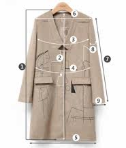 | 尺码 | ①前衣长 | ②后中长 | ③胸围 | ④腰围 | ⑤下摆围 | ⑥肩宽 | ⑦袖长 | ⑧袖臂围 | ⑨袖口围 | ||