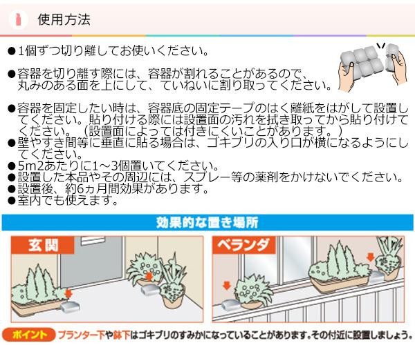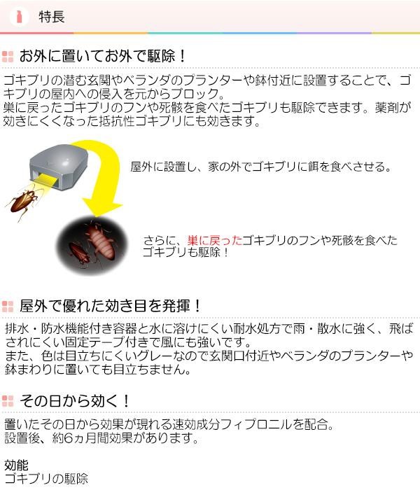 | ゴキブリの潜む玄関やベランダのプランターや鉢付近に設置することで、ゴキブリの屋内への侵入を元からブロック。巣に戻ったゴキブリのフンや死骸を食べたゴキブリも駆除できます。薬剤が効きにくくなった抵抗性ゴキブリにも効きます。 |