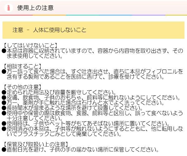 | 成分 | 有効成分:フィプロニル0.05%(w/w) その他成分:液糖、濃グリセリン、安息香酸デナトニウム、香料、黄色4号、その他8成分 |