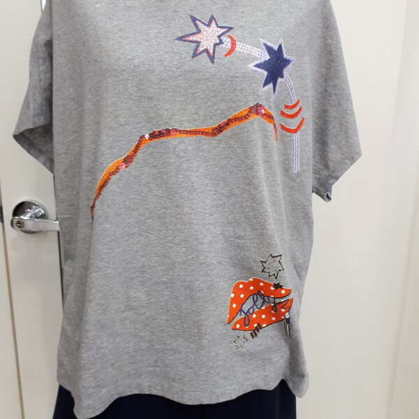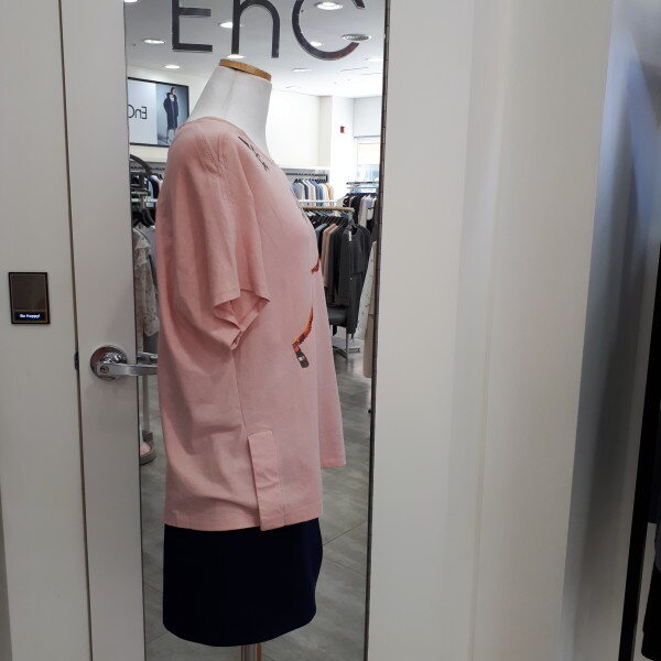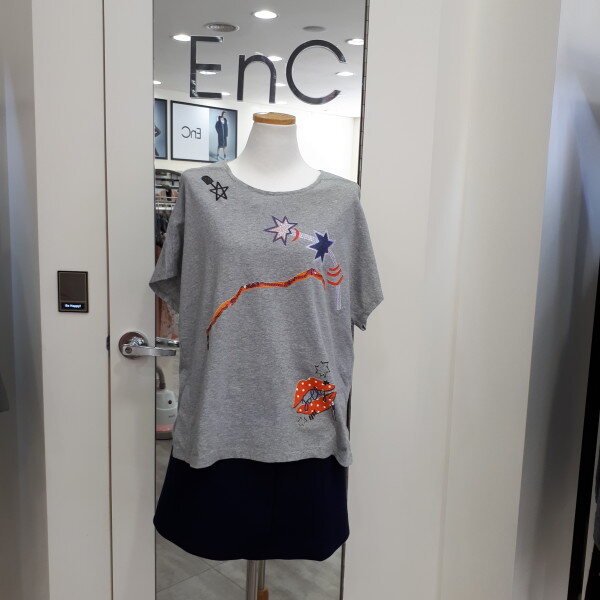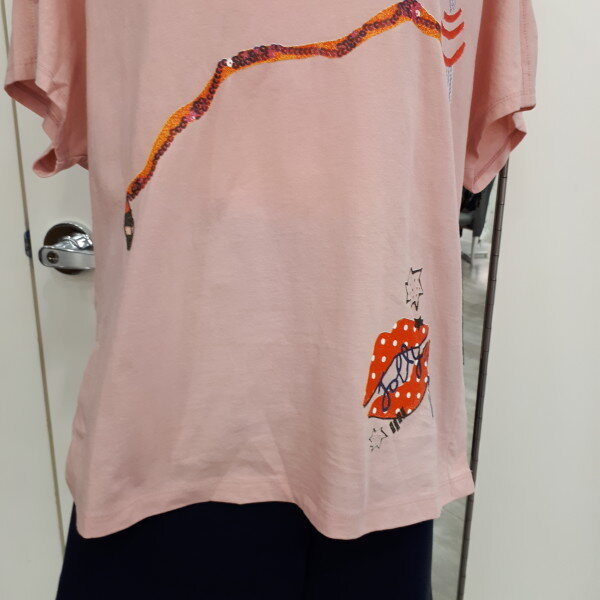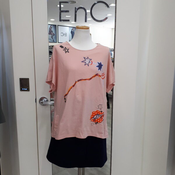 귀여운 프린트에 루즈핏의 소매 가오리 반팔 라운드에 목선에 어깨선과 옆하단부분에 디테일이 포인트인 아이템입니다