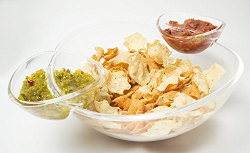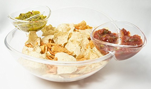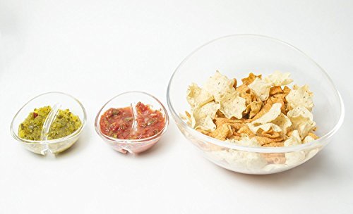 Create a dazzling centerpiece at casual or upscale celebrations with this beautiful Chips n' Dip set. Constructed of sturdy clear acrylic for a look that goes great with any season, this Snack Bowl set ensures that all guests will have no trouble making their way to the food/snack table. Versatile Serving Piece With Multi Uses, You can use this as a standard Chip bowl, and put salsa in the dip bowls, or you can make a big salad, and put a different dressing in each dip bowl, or strawberries and chocolate/cream as a dessert. This is excellent for parties, BBQ's, any family/friends get-together. Specification: - Will enhance any party