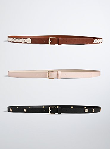 Belts are usually a last-minute addition to an outfit; these belts have outfits built around them. The set of three includes blush pink faux leather, black faux leather studded with gold tone floral appliques, and brown faux leather with boho white crochet.
