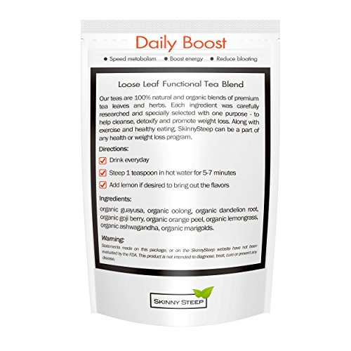 -. Binding : Health and Beauty -. Brand : SkinnySteep -. Department : unisex-adult -. EAN : 0702795220488 -. Feature : PREMIUM INGREDIENTS: The most premium ingredients in the industry, all 100% organic. Nothing machine ground, only whole pieces of exclusive herbs and tea leaves that are blended by hand in the USA. / WEIGHT LOSS RESULTS: Our professionally developed formula is proven to boost metabolism and suppress hunger. It's why we have thousands of satisfied REAL customers. / DETOXIFY YOUR SYSTEM: Contains ingredients shown to naturally flush toxins from your system. / REDUCE BLOATING: From the very first cup you'll notice less bloating and a flatter looking belly. / NON-LAXATIVE: Provides natural detox and digestion support without any laxatives. -. IsAdultProduct : 0 -. Label : SkinnySteep -. Manufacturer : SkinnySteep -. MPN : DS100 -. PackageQuantity : 1 -. PartNumber : DS100 -. ProductGroup : Health and Beauty -. ProductTypeName : HEALTH_PERSONAL_CARE -. Publisher : SkinnySteep -. Studio : SkinnySteep -. Title : Organic Slimming Diet Tea by SkinnySteep with Guayusa Leaf - Natural Skinny Tea with Proven Weight Loss and Belly Flattening Results - Made in USA with Ultra-Premium Ingredients - 1 Month Supply -. UPC : 702795220488