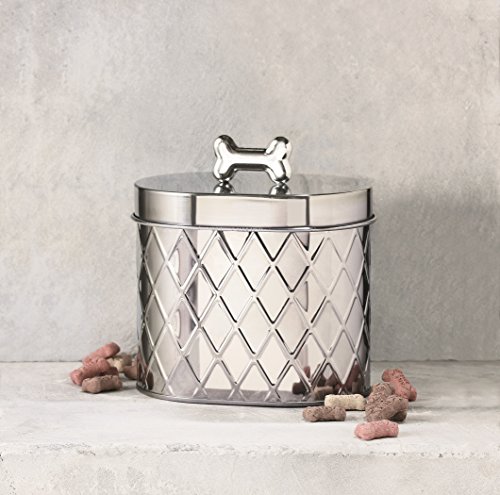 Amici Pet, 7CDI034R, Chance Oval Metal Treats Storage Canister, Stainless Steel Diamond Texture, Silver Tone Bone Knob, Food Safe, 52 Ounces