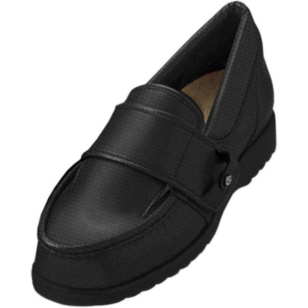 | 外出から冠婚葬祭まで対応できる、一見リハビリシューズとは分からないデザインが人気です。大きく履き込み口が開くので足入れがスムーズです。ベルトはご自分の足に合わせてしっかりと固定できるタイプです。またベルトには指をひっかけられるようになっているので、簡単に着脱ができるようになっています。足にぴったりと合うカップインソールは取り外しが可能で、包帯や小さめの装具をつけてもご使用いただけます。 |
